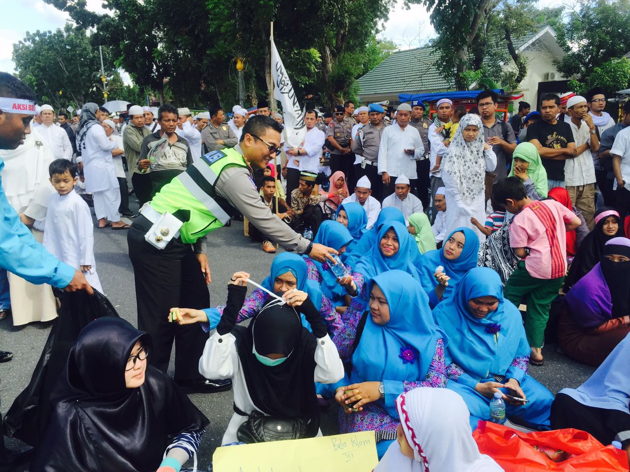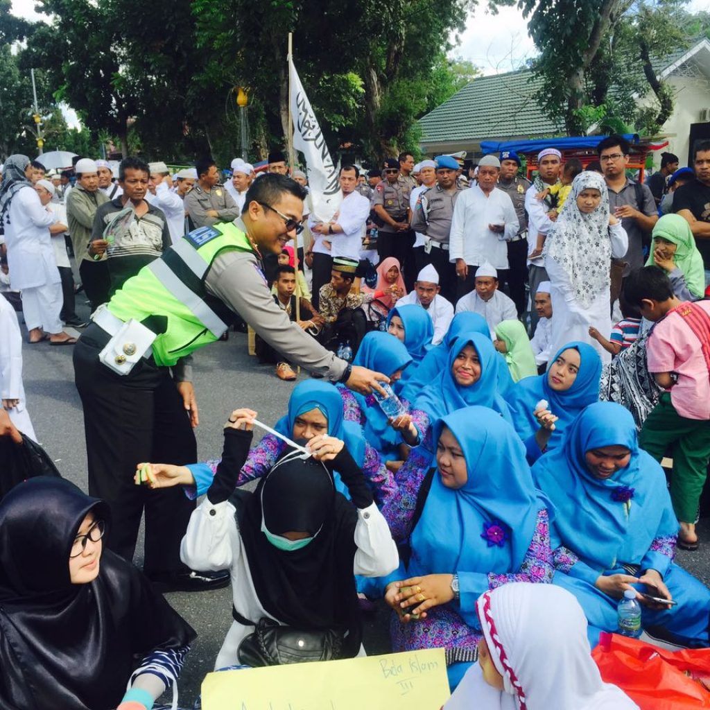Aksi damai ini juga terlihat jelas antara petugas Kepolisian dan massa aksi damai saat aksi berjalan. Terlihat Kasat Lantas Polresta Pekanbaru Kompol Budi Setiawan, SIK, MIK memberikan air mineral kepada peserta aksi damai Jumat, (2/12) siang.