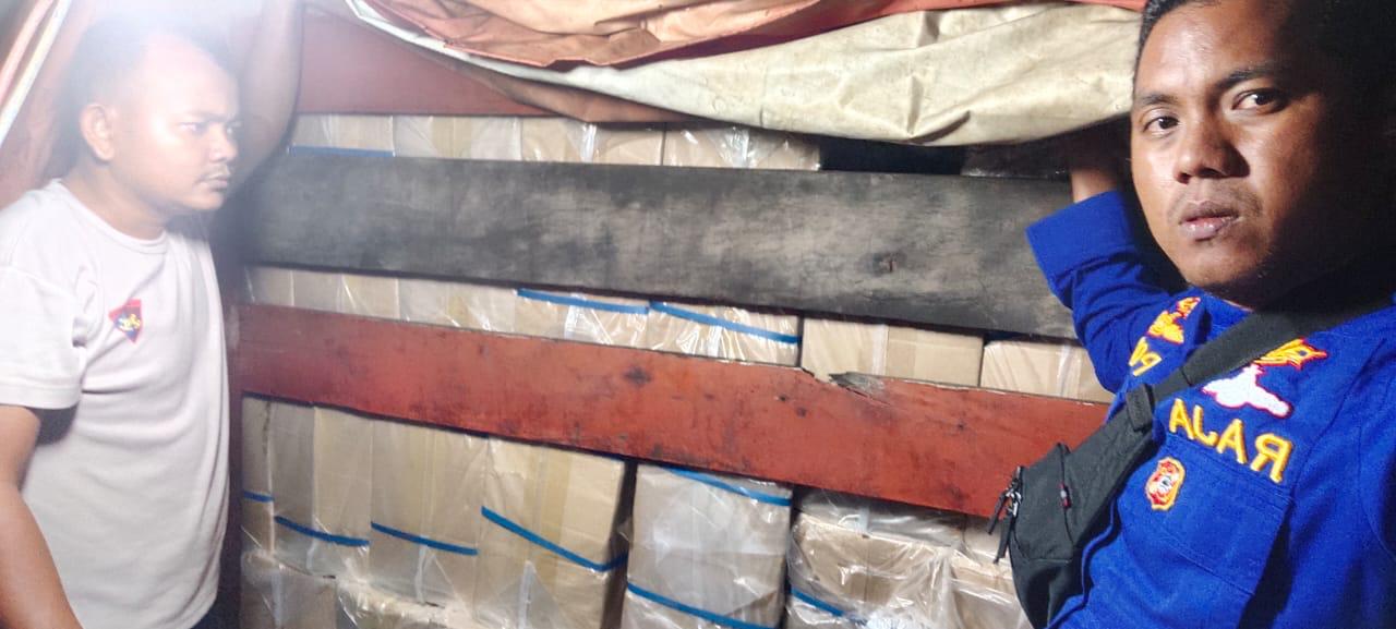 Kapal tersebut bermuatan buah kelapa yang memenuhi lambung kapal. Namun setelah dilakukan pemeriksaan lebih teliti lagi, ternyata dibagian bawah kelapa ditemukan 1.062 Dos Rokok Merk Luffman merah dan silver ditutup terpal.