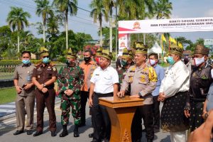 Bupati Siak Alfedri menyampaikan selamat hari Bhayangkara ke-74 untuk Polda Riau bersama Polres Siak saat acara Bakti Sosial Serentak yang pelepasan pembagian bansos dilaksanakan di depan Istana Siak,Jumat (26/6/2020).