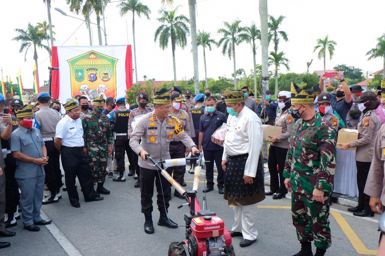 Sebelum Pelepasan Pemberian Bantuan Bupati Siak Alfedri menerima bantuan hand tractor dari Kapolda Riau yang nantinya akan disalurkan kepada petani di Kebupaten Siak.