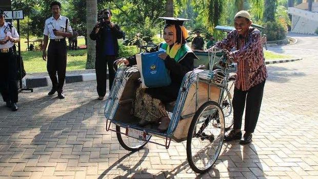Raeni saat diantar ayahnya wisuda S1 dengan becaknya pada 2014 silam.Raeni saat diantar ayahnya wisuda S1 dengan becaknya pada 2014 silam. Foto: Humas Unnes