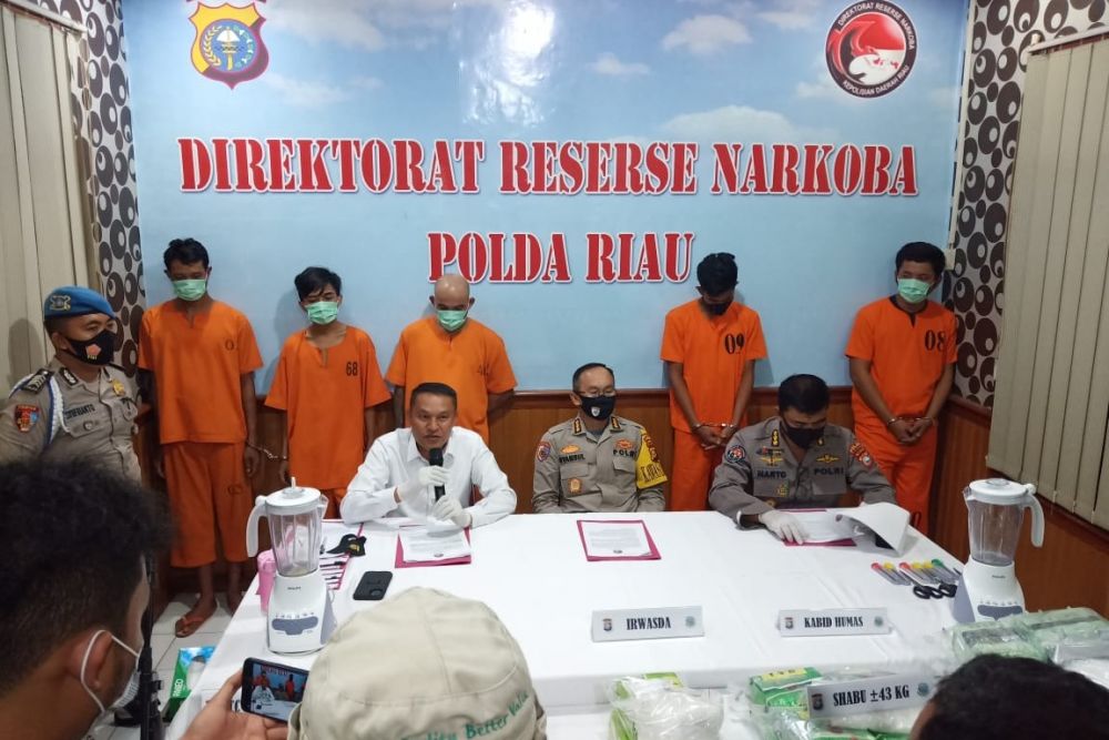 PEKANBARU, SIAGANEWS.ID – Kepolisian Daerah Riau melalui Ditresnarkoba Polda Riau berhasil membongkar tiga jaringan narkoba internasional. Dari tiga jaringan itu, polisi berhasil menyita 43 kilogram sabu dan 21 ribu butir pil ekstasi.
