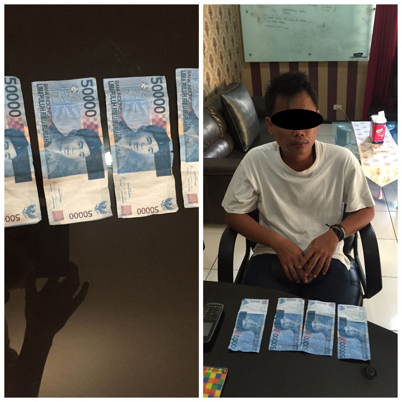 PEKANBARU, SIAGANEWS.CO – OH alias Oki diringkus Sat Opsnal Polsek Senapelan, Kamis (13/10/2016) atas kepemilikan uang palsu (Upal). Polisi menyita empat lembar uang pecahan Rp 50 ribu saat dilakukan penggeledahan badan. Oki yang ditetapkan tersangka ditangkap di area perumahan Kampung Dalam. Kapolsek Senapelan, Kompol Dodi Harza Kesuma mengatakan, saat ini tersangka dan barang bukti sudah diamankan di mapolsek. Menurutnya, pengungkapan kepemilikan upal tersebut berawal dari informasi warga yang resah dengan peredaran upal. Kemudian dilakukan penyelidikan dan hasilnya dicurigai tersangka Oki.