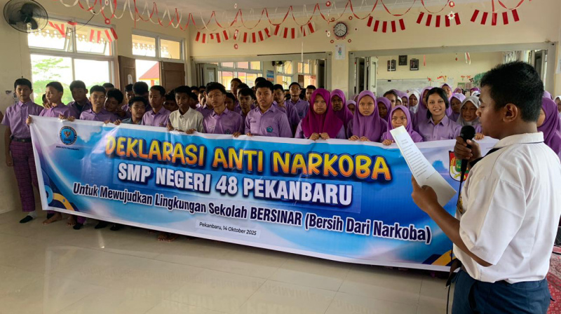 SiagaNews – Badan Narkotika Nasional (BNN) Kota Pekanbaru melaksanakan sosialisasi bahaya penyalahgunaan narkoba dikalangan siswa-siswi SMPN 48 Pekanbaru, Selasa, 14 Oktober 2025.