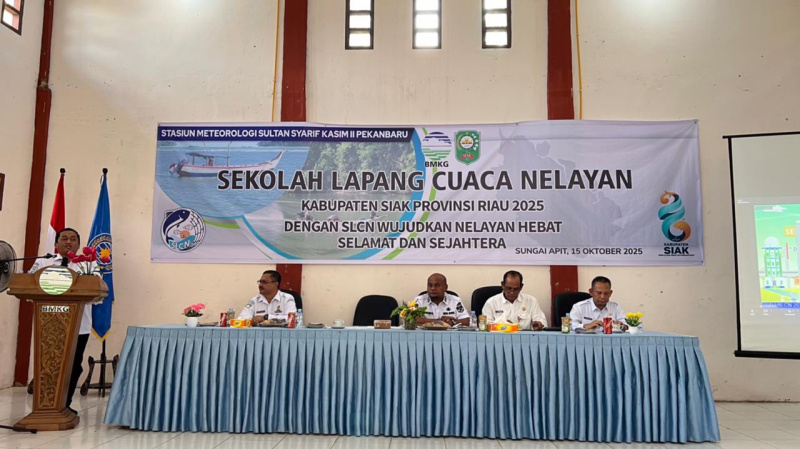 SiagaNews – Badan Meteorologi, Klimatologi, dan Geofisika (BMKG) melalui Stasiun Meteorologi Sultan Syarif Kasim II Pekanbaru menyelenggarakan kegiatan Sekolah Lapang Cuaca Nelayan (SLCN) di Desa Teluk Batil, Kecamatan Sungai Apit, Kabupaten Siak, Provinsi Riau, Rabu, 15 Oktober 2025.