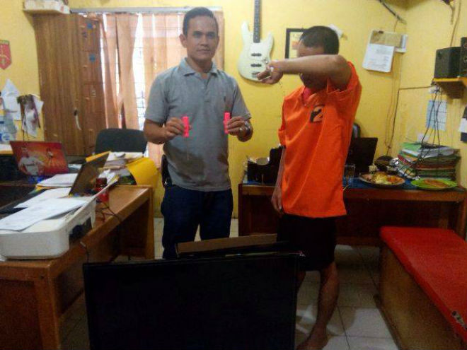 Hanya hitungan menit, tersangka keluar sambil menyerahkan diri. Sore itu juga tersangka diserahkan ke pihak berwajib. Selain tersangka, polisi menyita barang bukti hasil kejahatan diantaranya, obeng, televisi, satu unit monitor computer.(**)