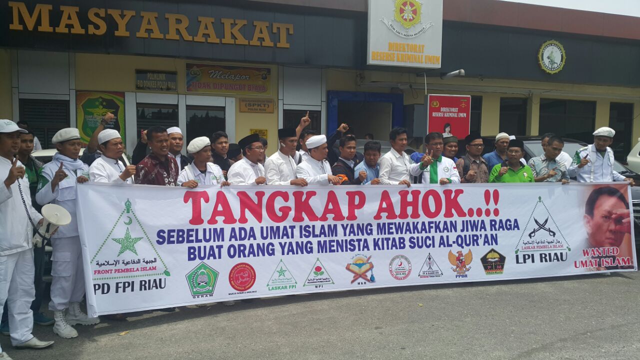 Membawa spanduk yang bertuliskan tangkap Ahok, massa aksi langsung memasuki ruang SPKT Polda Riau untuk memasukan laporan. Selama proses Laporan tersebut, massa aksi berorasi yang isinya mengecam komentar Ahok yang melukai umat Islam.