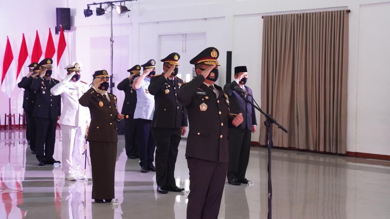 bersama Gubernur Riau H Syamsuar, Kajati Riau Mia Amiati, Danrem 031/WB Brigjen TNI Muh Syech Ismed SE MHan, Danlanud RSN Marsma Ronny Irianto Moningka, Wakapolda brigjen Pol Drs Tabana Bangun MSI, Danlanal Dumai Kolonel Laut (P) Himawan usai mengikuti upacara secara virtual di Mako Brimob Polda Riau berkesempatan memberikan penjelasan kepada media.