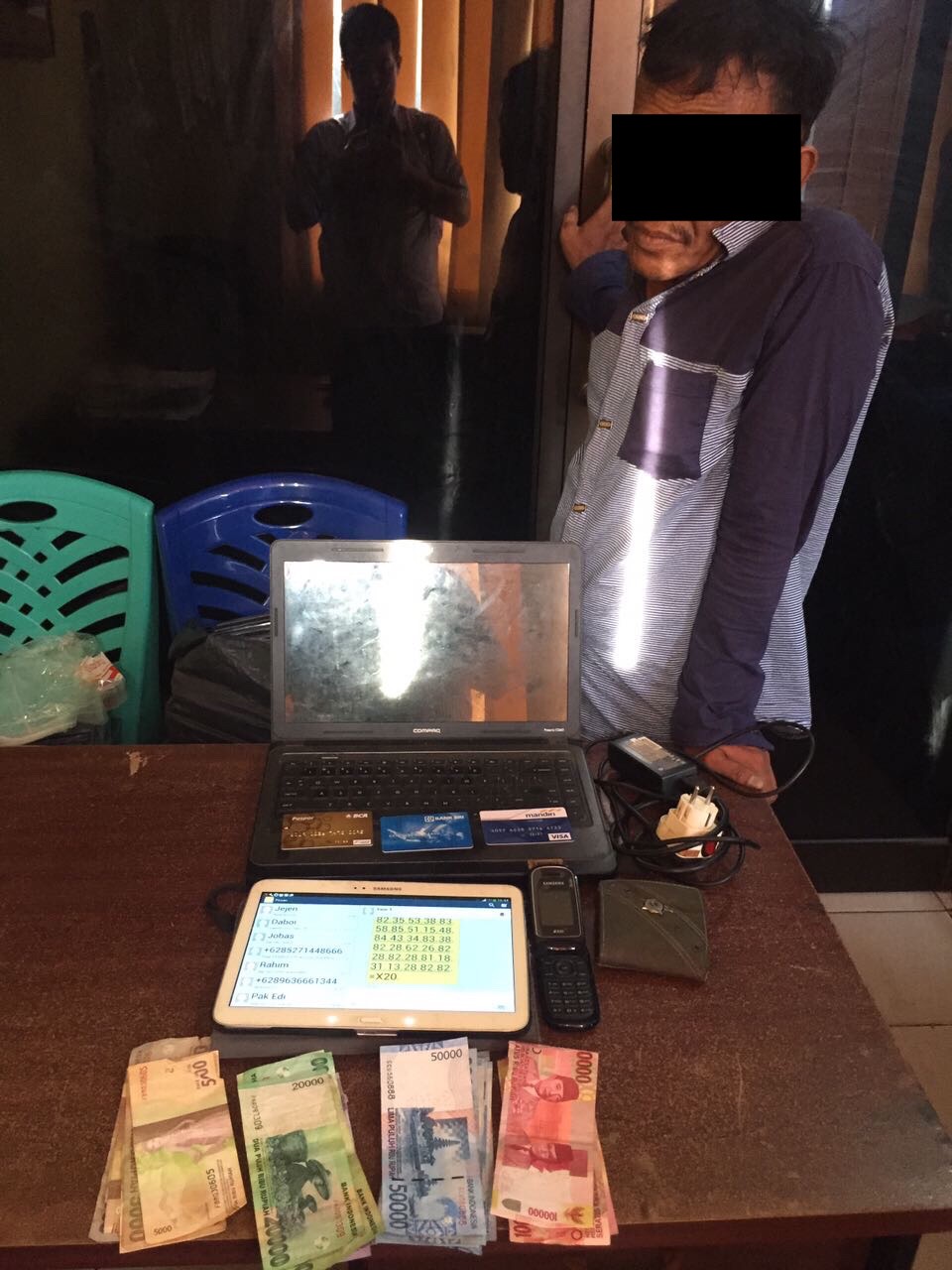 Dari penangkapan tersebut dimankan dua orang pelaku an. DK dan TA beserta barang bukti berupa uang tunai sejumlah Rp. 1.034.000, 1 (satu) Unit laptop merk compaq warna hitam type presario CQ43 beserta cas, 1 (satu) unit hp merk samsung galaxy tab 3 warna putih dengan no. GSM 082168534600 dan 1 (satu) lembar kartu ATM.