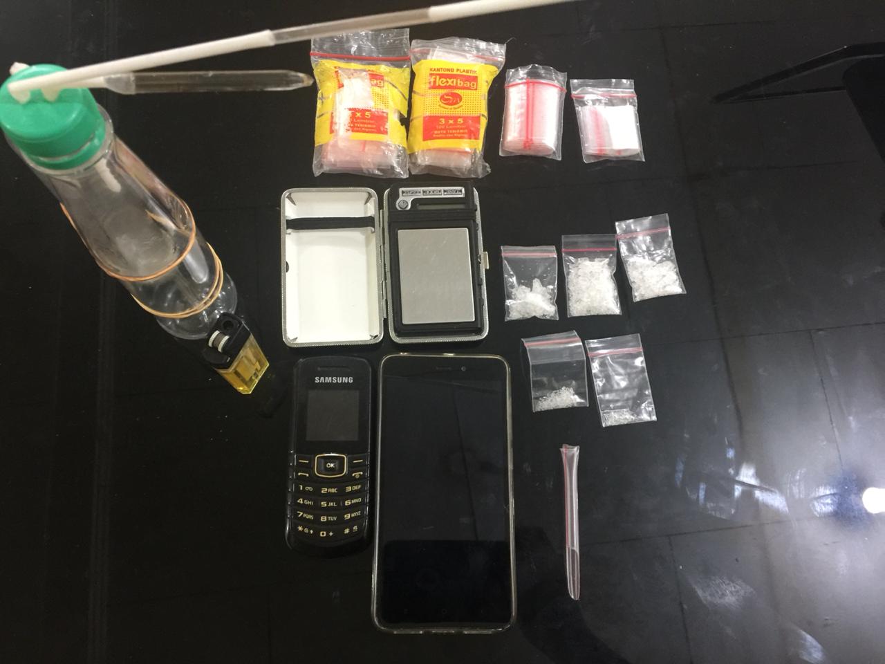 Kemudian dua plastik kecil berles merah berisikan plastik kecil jumlah 30 bungkus, satu alat timbangan merek constant, warna hitam, dua alat hisap bong dibuat dari botol minuman.
