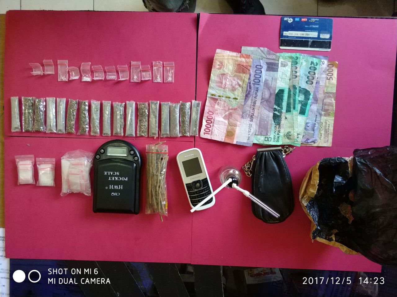 Dari tangannya polisi mendapatkan barang bukti sebanyak 12 paket sabu kemudian 17 paket daun ganja kering serta bungkus batang tanaman ganja yang sudah dikeringkan.
