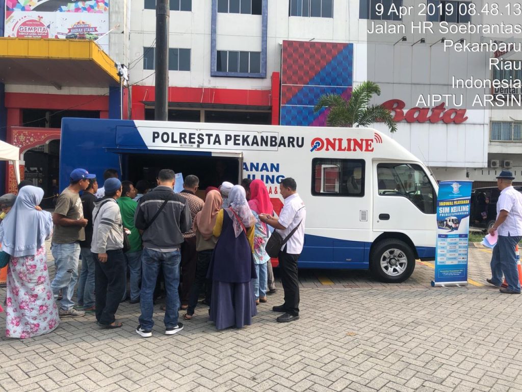 PEKANBARU, SIAGANEWS.CO – Pelayanan mobil unit SIM Keliling milik Satlantas Polresta Pekanbaru hari ini beroperasi di parkiran Mal Giant Panam, Jalan HR. Subrantas, Selasa (9/4/19).