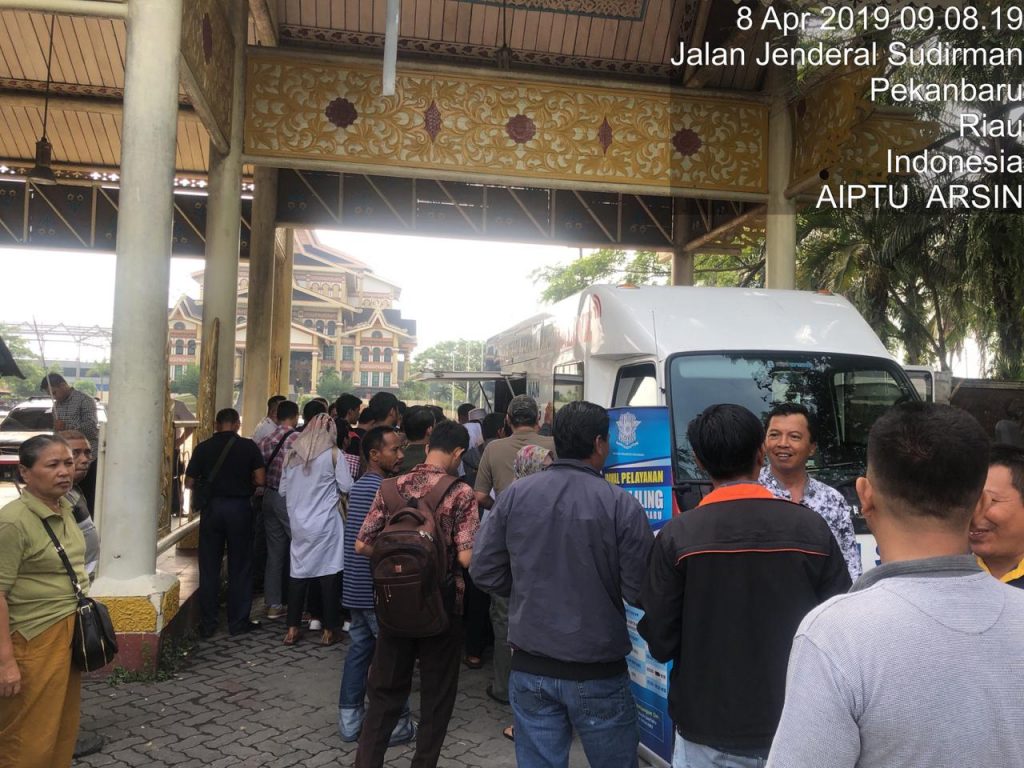 PEKANBARU, SIAGANEWS.CO – Pelayanan mobil unit SIM Keliling milik Satlantas Polresta Pekanbaru hari ini beroperasi di depan purna MTQ Jalan Sudirman, (8/4/19).