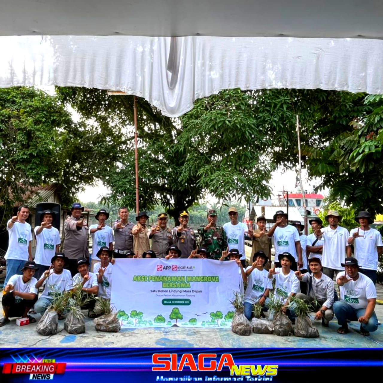 Siak, Siaganews.id – Komitmen menjaga kelestarian lingkungan terus ditunjukkan APP Group melalui unit usahanya, PT Indah Kiat Pulp and Paper (PT IKPP) Perawang. Bersama TNI-Polri dan elemen masyarakat, perusahaan ini menanam sebanyak 5.000 pohon mangrove di tepian Sungai Siak, tepatnya di Dusun Pertiwi, Kampung Pinang Sebatang Timur, Kecamatan Tualang, Kabupaten Siak, Riau, Selasa (23/12/2025).