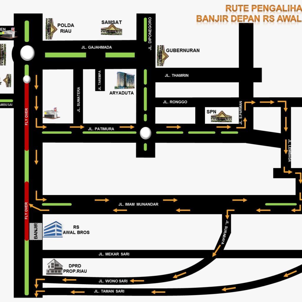 “pengalihan hanya dilakukan jika situasi arus lalu lintas memadat dan tidak memungkinkan untuk melalui ruas jalan Sudirman yang tergenang air (depan awal bross)”, terang Fandri.