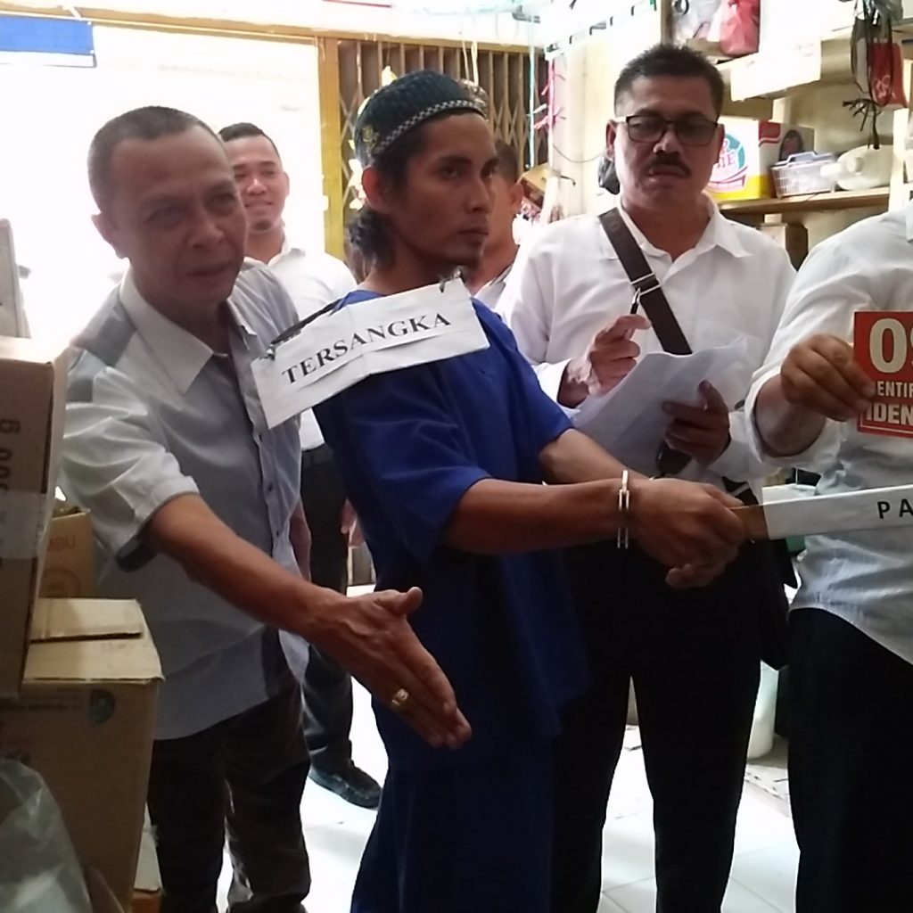 Saat penyidik mengarahkan adegan sesuai dengan berita acara, tersangka tampak sesekali melengkapinya dan tenang memperagakan kembali pembunuhan yang dilakukannya.