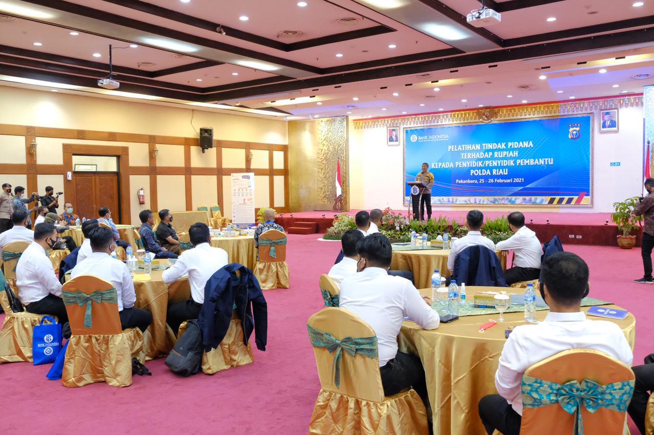 Pelatihan ini dilakukan terhadap Penyidik/Penyidik Pembantu Polda Riau dan jajaran selama dua hari ini, Kamis dan Jumat (25/02). Dalam Pembukaan acara ini dihadiri oleh Kapolda Riau, Irjen Pol Agung Setya Imam Efendi, Pimpinan Bank Indonesia Perwakilan Provonsi Riau, Decymus S.E,M.A. Deputi Direktur BI, Arsal Mashuri. Direktur dan Pejabat Eselon Bank Indonesia Perwakilan Provinsi Riau. Dir Reskrimsus Polda Riau, para Narasumber dan tiga puluh orang peserta pelatihan yang merupakan Penyidik dan Penyidik Pembantu di lingkungan Direktorat Reserse Kriminal khusus Polda Riau dan dari Reserse Kriminal Polres jajaran.