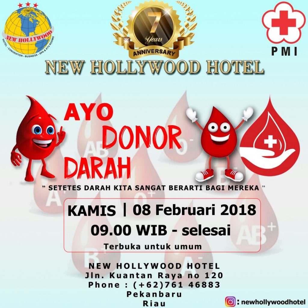 PEKANBARU, SIAGANEWS.CO – New Hollywood Hotel menggelar kegiatan donor darah dalam rangka Anniversary nya yang ke tujuh.