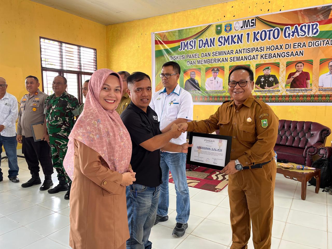 Kotogasib, siaganews.id-JMSI Siak memberikan apresiasi dan ucapan Terima kasih kepada SMKN 1 Kotogasib, dan para pendukung kegiatan diacara yang di gelar di Aula sekolah tersebut dengan Tema “Antisipasi Hoax dan Menumbuhkan Semangat Kebangsaan” Selasa (18/2/2025).