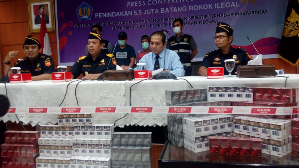 Saat konferensi pers itu, telah diamankan sebanyak 5.578.600 batang rokok tanpa diketahui pita cukainya serta dua orang tersangka yang berinisial (D) sebagai penyedia rokok ilegal dan (W) pedagangnya.