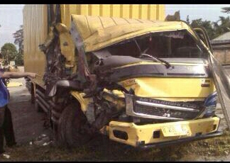 Kecelakaan melibatkan satu unit mobil fuso tronton dengan truk box colt diesel.
