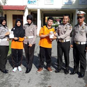 Tidak hanya sekedar sosialisasi, Kepolisian juga menyiapkan souvenir menarik bagi para siswa yang dapat menjawab pertanyaan kuis yang diberikan. Abdi dan Miska dua dari siswa tersebut beruntung mendapatkan Mug pelopor keselamatan berlalu lintas.