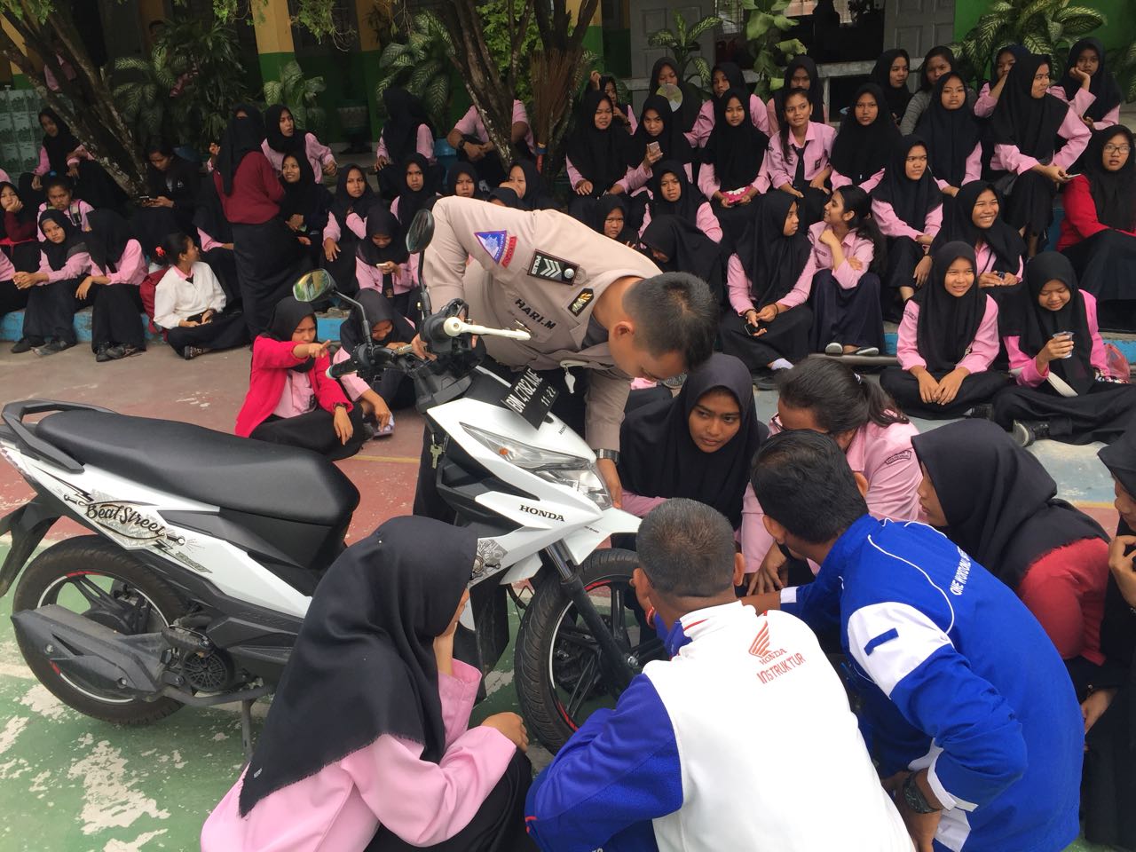 Alat peraga satu unit sepeda motor juga dihadirkan untuk mempermudah sarana edukasi. Instruktur dari sekolah mengemudi RSDC Pekanbaru juga terlihat serius mengajakan bagaimana cara berkendara dan juga pengenalan komponen kendaraan.