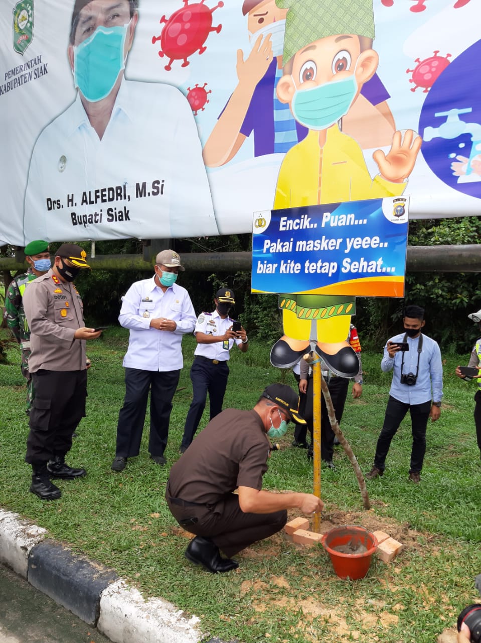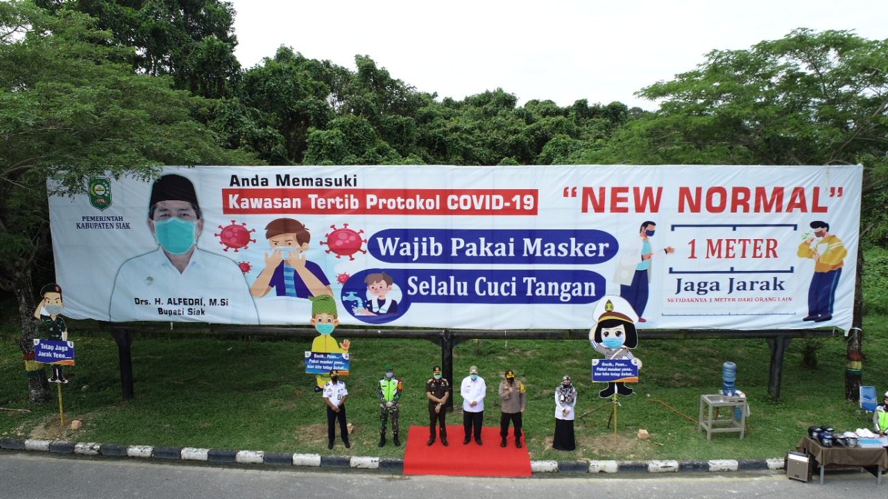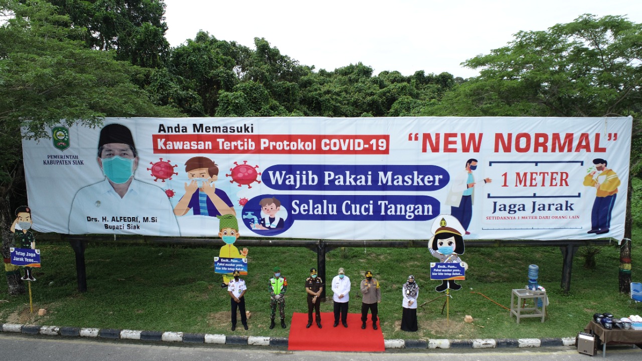 Bupati Siak Alfedri didampingi Kapolres Siak AKBP Doddy F.Sanjaya dan Forkopimda Kabupaten Siak Launching Kawasan wajib tertib Protokol Kesehatan Covid – 19 Menuju New Normal, kegiatan tersebut di pusatkan di bundaran Jembatan Siak (Mempura) yang dijadikan Kawasan tertib Protokol Covid 19.( 17/06/2020 ).