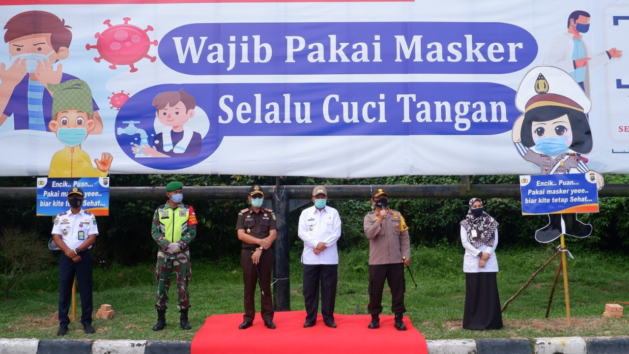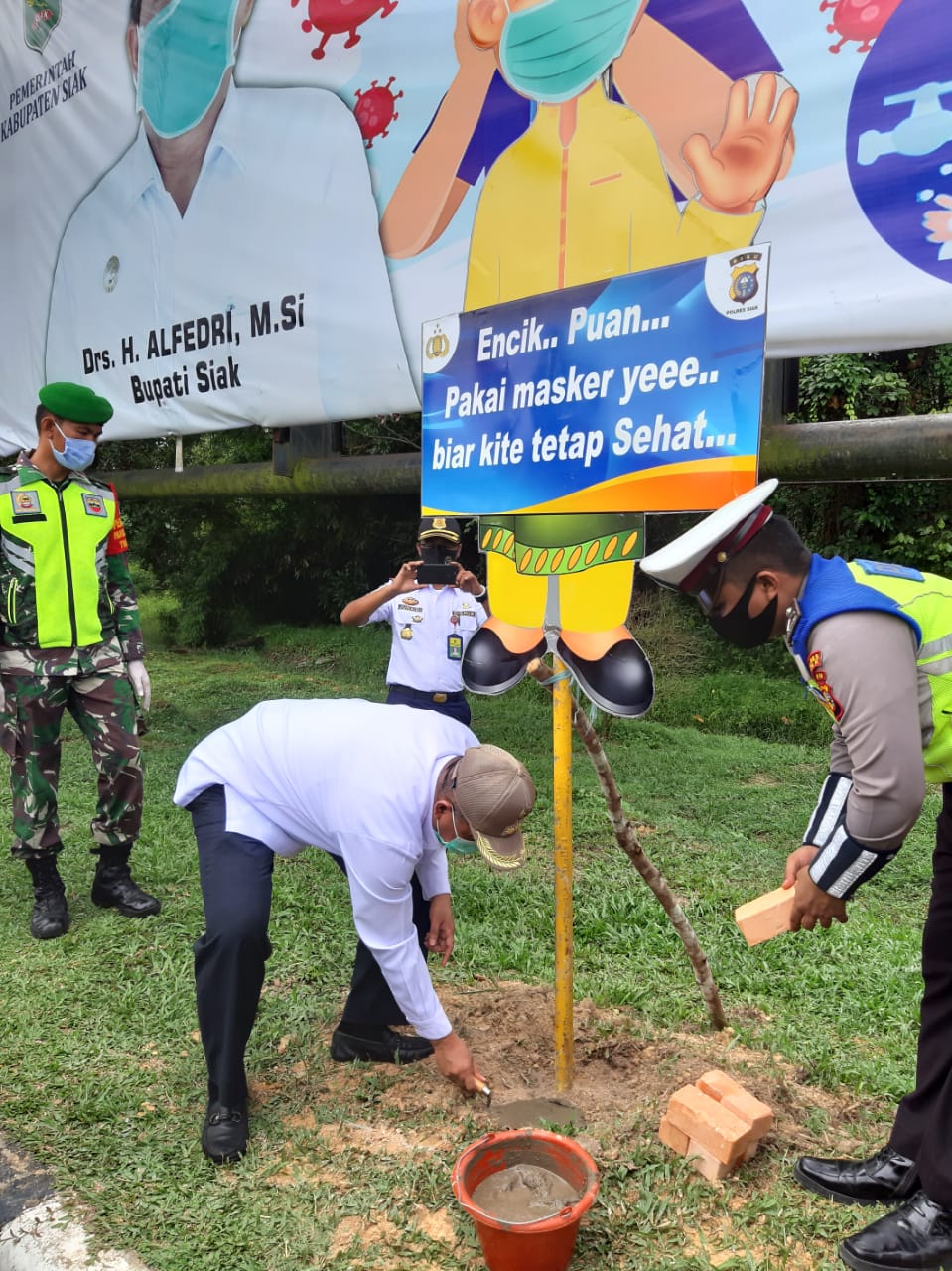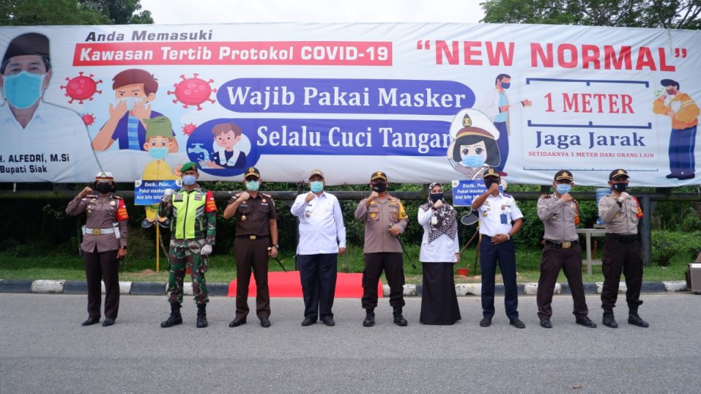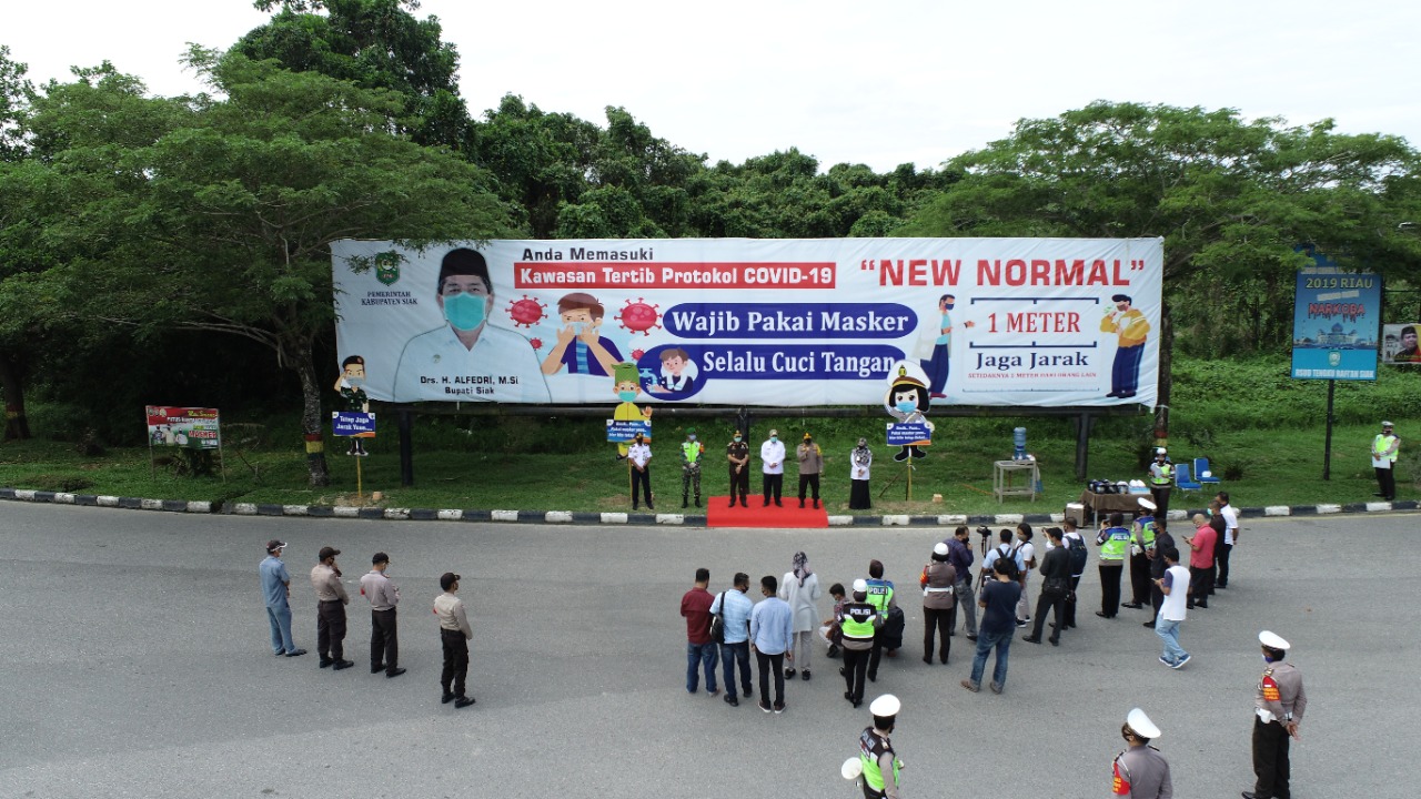 Bupati Siak Alfedri didampingi Kapolres Siak AKBP Doddy F.Sanjaya dan Forkopimda Kabupaten Siak Launching Kawasan wajib tertib Protokol Kesehatan Covid – 19 Menuju New Normal, kegiatan tersebut di pusatkan di bundaran Jembatan Siak (Mempura) yang dijadikan Kawasan tertib Protokol Covid 19.( 17/06/2020 ).