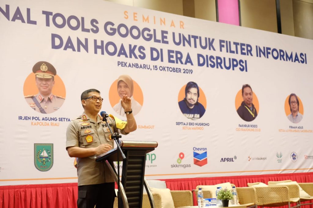PEKANBARU, SIAGANEWS.ID – Kapolda Riau, Irjen Pol Drs Agung Setya Imam Effendi tadi pagi hadir sebagai pembicara dalam acara “Mengenal Tools Google Untuk Filter Informasi Dan Hoaks Di Era Disrupsi”. Dengan paparan Kapolda Riau sendiri berjudul Ancaman Hoax dan Penegakan Hukum di Hotel Grand Zuri Jalan Soekarno Hatta Pekanbaru tadi pagi (15/10)