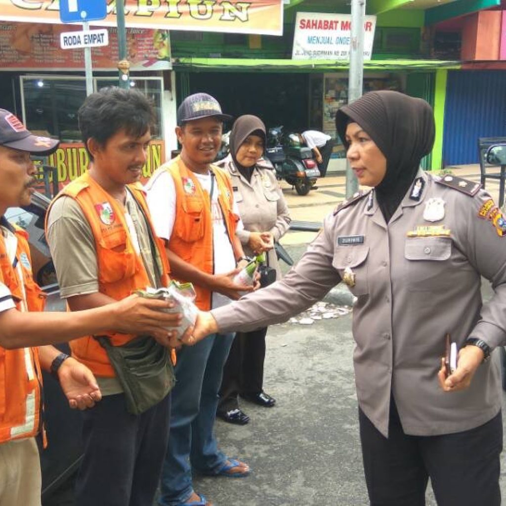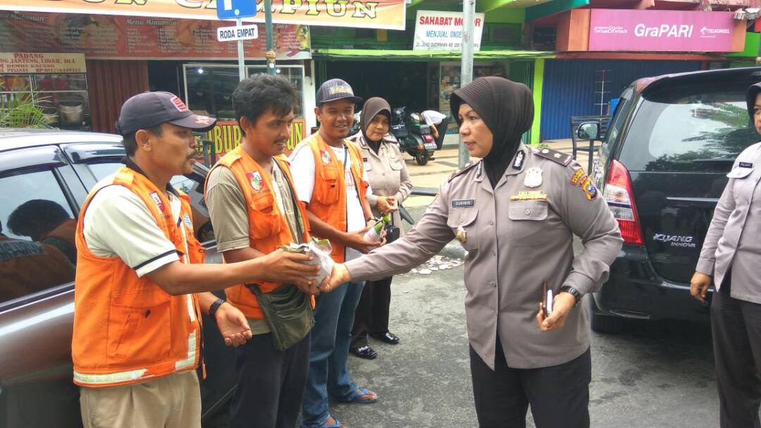 Dalam kegiatan Jumat Barokah ini, selain membagikan nasi bungkus, Polwan Polresta Pekanbaru juga menyampaikan himbauan Kamtibmas kepada juru parkir yang menerima nasi bungkus tersebut.