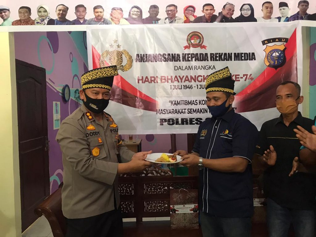 Pemberian tali asih kepada insan pers dipimpin Kapolres Siak AKBP Doddy F Sanjaya, didampingi beberapa pejabat utama rombongan disambut ketua PWI Siak Ali Masruri, Ketua AWIKS Zulfahmi, Ketua IWO Siak Fitriadi dan sejumlah wartawan.