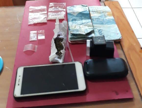 Dua plastik bening ukuran kecil, satu paket diduga daun ganja, uang tunai Rp 740 ribu, satu kotak rokok dan dua hape.
