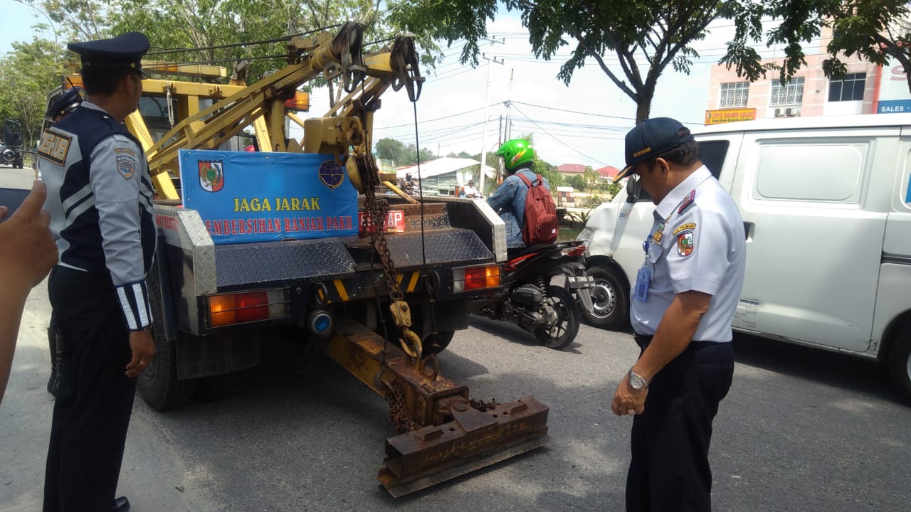 “Pagi ini kita turun di lokasi yang saat ini sudah kami lakukan sosialisasi dan peringatan yakni di jalan Diponegoro, jalan Hangtuah dan jalan Senapelan (Kimteng, red). Kami lihat masih ada mobil yang parkir liar, makanya kami langsung derek,” kata Kepala UPT Parkir Dishub, Khairunnas.