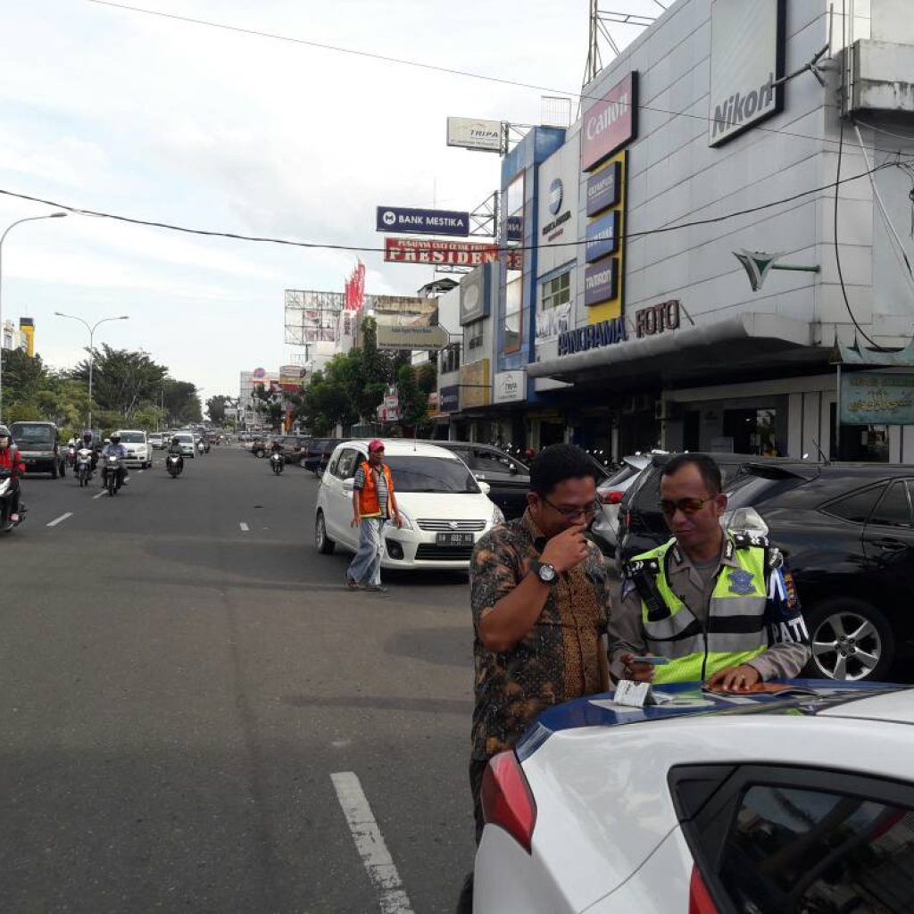 Pantauan Siaganews.co kendaraan patroli roda empat milik Sat Lantas Polresta Pekanbaru tampak sedang menilang seorang pengendara mobil yang parkir berlapis sehingga dapat mengganggu kelancaran arus lalu lintas.