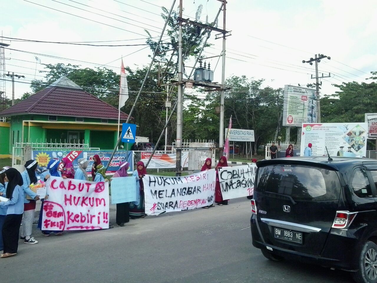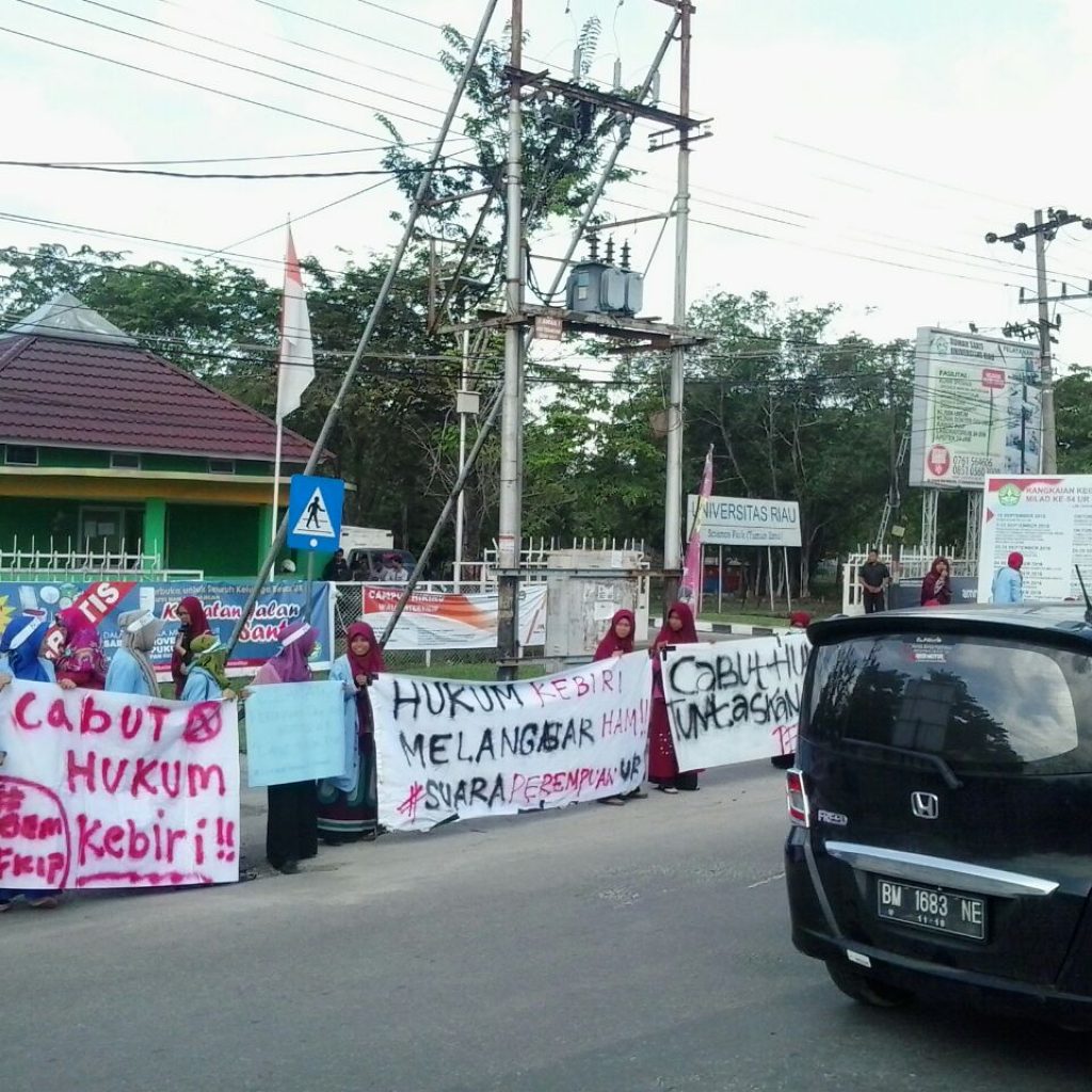 PEKANBARU, SIAGANEWS.CO – Aliansi Perempuan Universitas Riau Badan Eksekutif Mahasiswa (BEM) Universitas Riau (UR) Pekanbaru menggelar aksi damai di gerbang masuk kampus, Jalan HR Soebrantas, Kamis (10/11/2016).