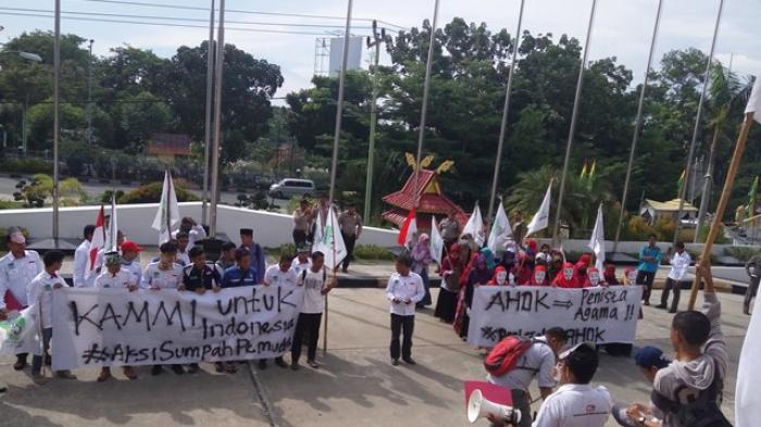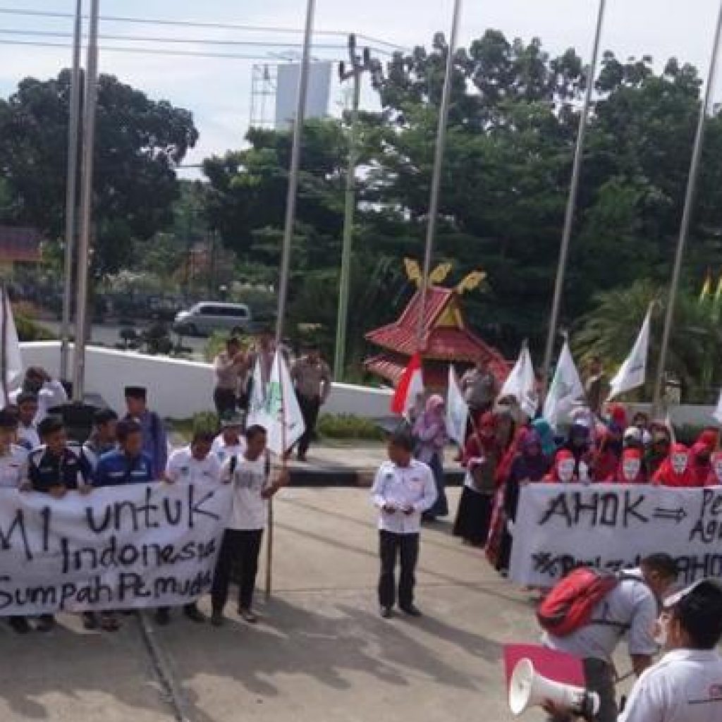 PEKANBARU, SIAGANEWS.CO- Puluhan massa aksi dari Kesatuan Aksi Mahasiswa Muslim Indonesia (KAMMI) berunjukrasa di Kantor DPRD Riau, Jum’at (28/10/2016) siang. Aksi damai memperingati hari Sumpah Pemuda tersebut menyuarakan terkait penistaan agama oleh Basuki Tjahaja Purnama alias Ahok. Massa mendesak penegak hukum memproses Gubernur DKI Jakarta tersebut.