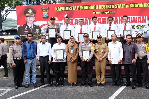 “Penghargaan ini diberikan kepada kita serta beberapa personel di Polresta Pekanbaru dan jajaran atas prestasi pengungkapan peredaran narkoba di Kelurahan Tanah Datar, Kecamatan Pekanbaru Kota, Tahun 2018,” kata Kapolres Pekanbaru.