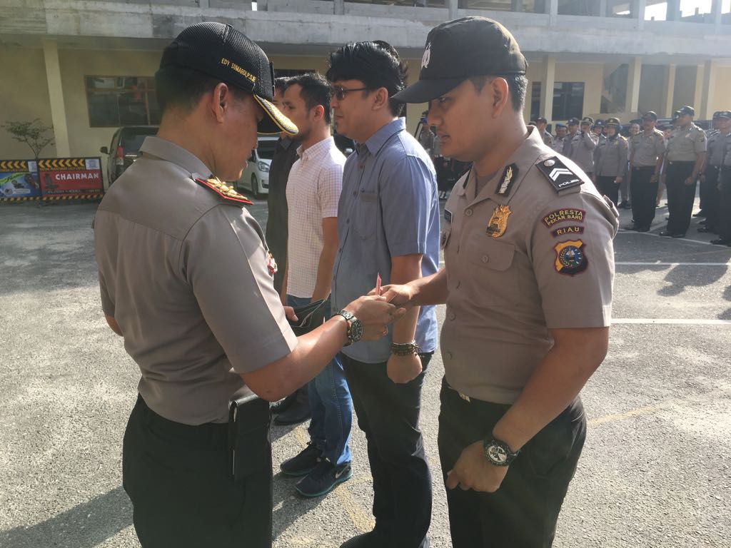 Apel pagi yang diawali dengan doa ini dilanjutkan dengan pemeriksaan pasukan oleh Wakapolresta Pekanbaru. Setelah itu Edy memerintahkan 4 orang personil Polresta Pekanbaru untuk mengucapkan Tri Brata, Catur Pra Setya dan Commander Wish Kapolri. Pengucapan tersebut berjalan lancar dan diikuti oleh seluruh peserta Apel.