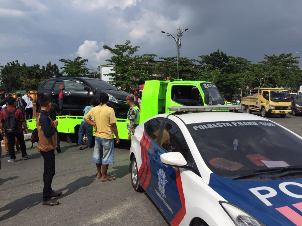 PEKANBARU, SIAGANEWS.CO – Satuan lalu lintas Polresta Pekanbaru evakuasi mobil Toyota Avanza warna Hitam yang diduga mengalami out of control di jalan SM. Amin tepatnya di Tugu Songket, Rabu (22/11). Mobil tersebut di evakuasi dengan menggunakan mobil derek.