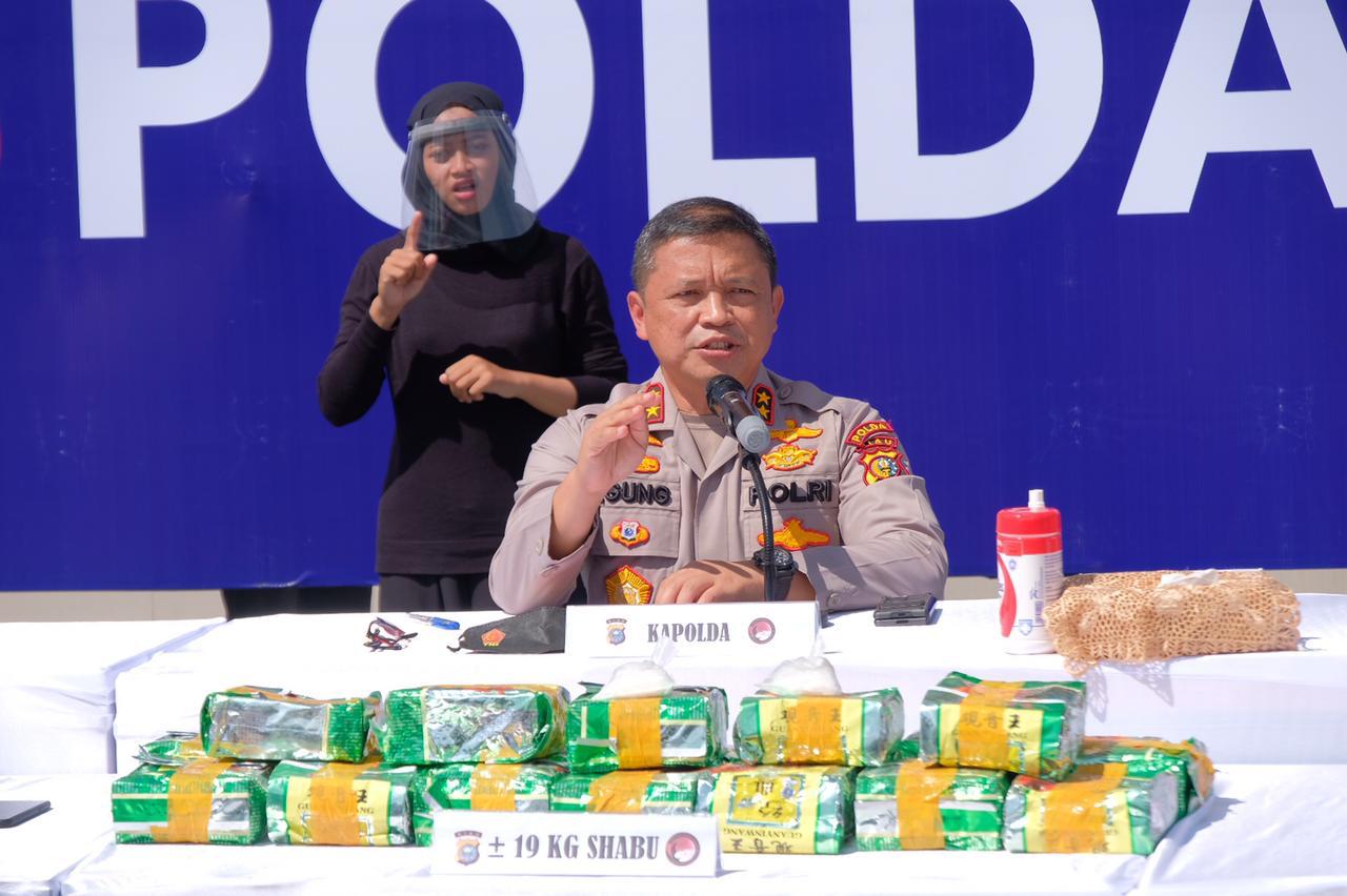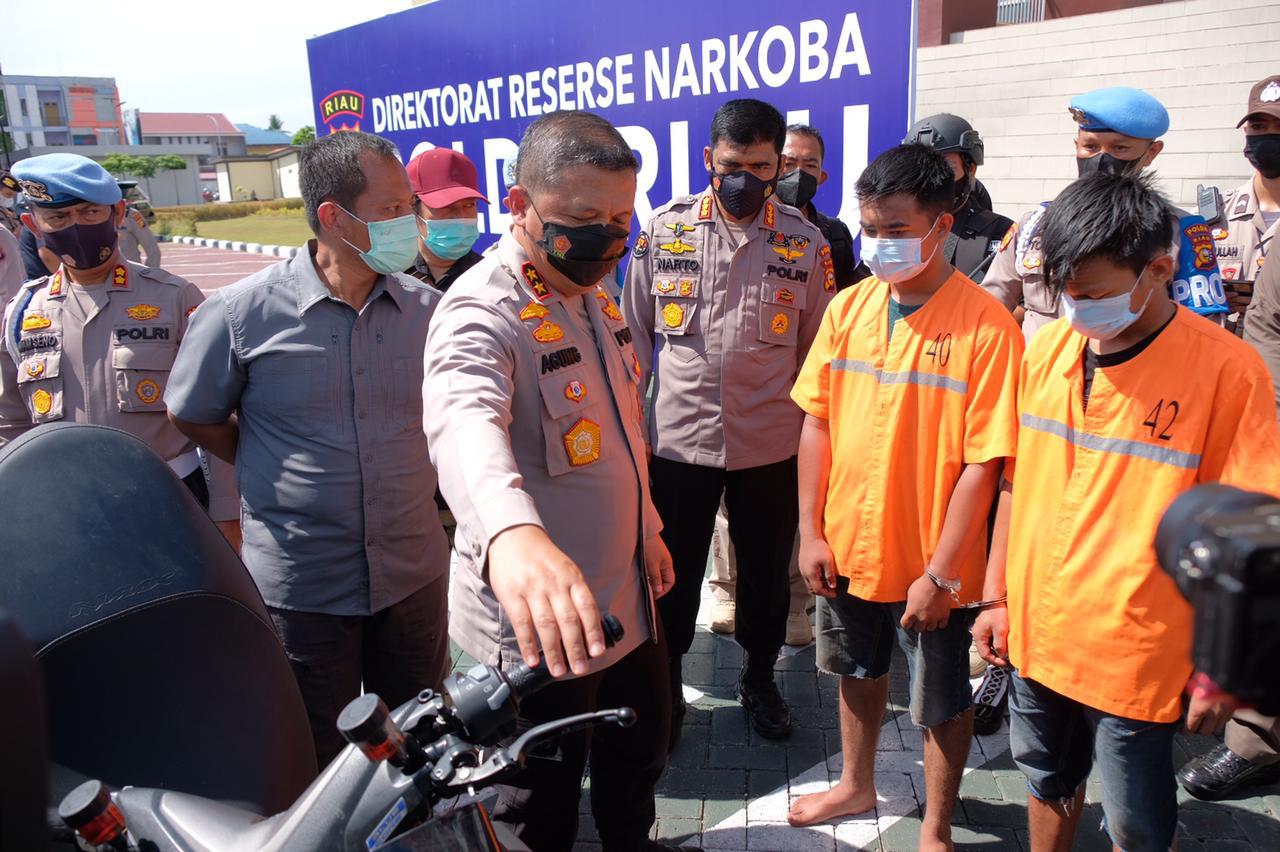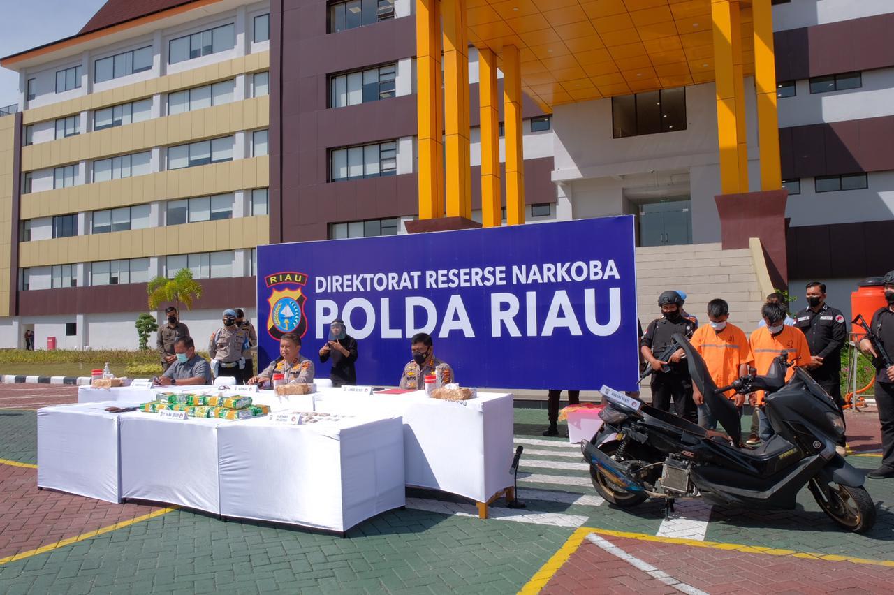 Kapolda Riau Irjen Agung Setia Imam Effendi SH SIK MSI menggelar konferensi pers bersama Direktur Reserse Narkoba Kombes Victor Siagian dan Kabid Humas Kombes Sunarto di Mapolda pada Selasa (22/6) mengatakan jajaran Polda Riau tetap menggelorakan perang dalam melawan narkoba.