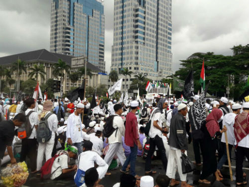 Peserta aksi datang dengan berjalan kaki dari Masjid Istiqlal. Mayoritas peserta aksi mengenakan baju koko berwarna putih dan tak ketinggalan kopiah di kepala.