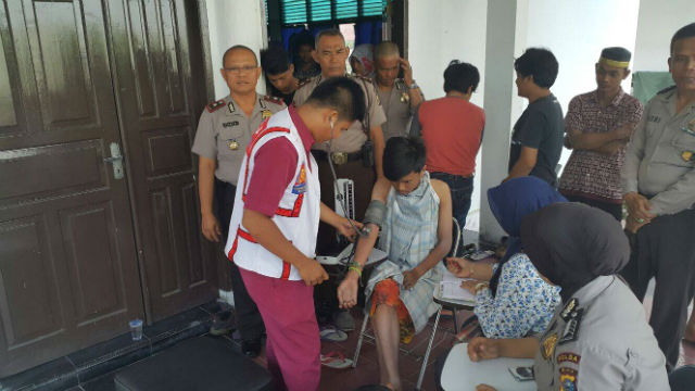 Terlihat Dokter Lena Bid Dokes Polda Riau, sedang memberikan layanan kesehatan kepada pasien pendita sakit, alergi,flu,demam di BLK Jalan Terubuk, Pekanbaru. (tim)