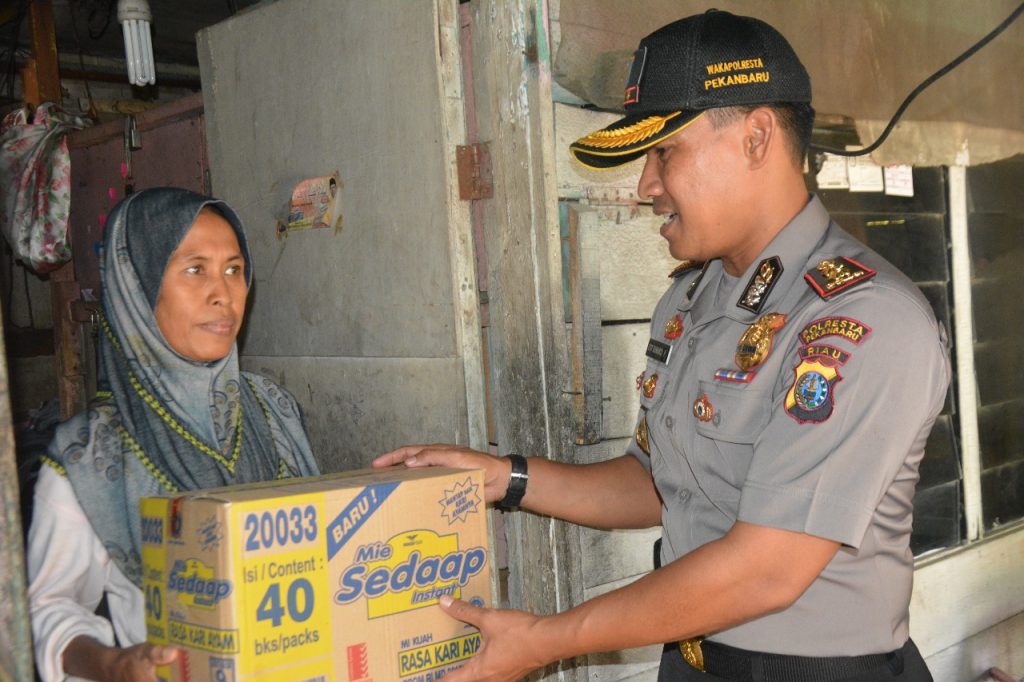 Dalam kesempatan ini kita memberikan bantuan sembako berupa beras, gula minyak goreng, mie instan dan telor kepada ibu Santi. Selain sembako, Polresta juga memberikan bantuan uang tunai yang mana uang tersebut merupakan hasil sumbangan dari seluruh personel Polresta Pekanbaru selama 1 minggu. Memang yang kami berikan ini tidak seberapa, tapi minimal dapat sedikit meringankan beban ibu dalam menjalani kehidupan sehari-hari, pungkas Edy.