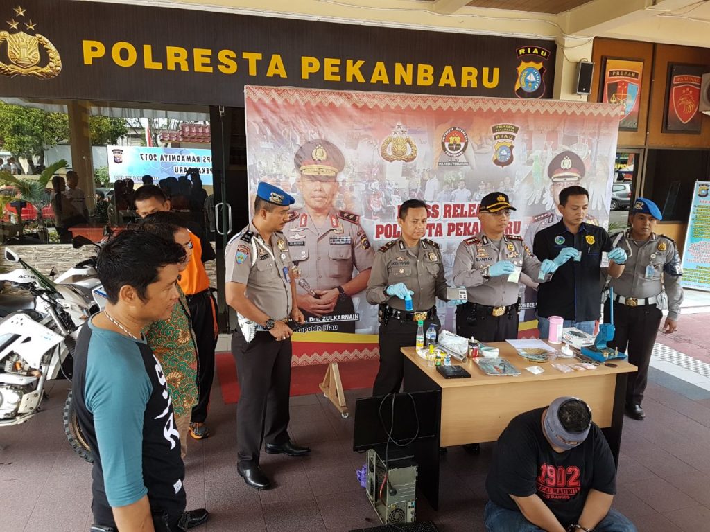 “Pastinya ada bahan campuran narkoba lainnya seperti sabu-sabu. Nah itu yang akan terus kita dalami,” terang Kapolresta Pekanbaru, Kombes Pol Susanto disela-sela ekspose tersangka dan barang bukti di halaman Mapolresta Pekanbaru, Jum’at (14/7/2017) siang.