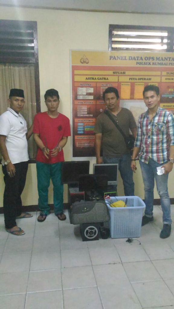 PEKANBARU, SIAGANEWS.CO – Dua bulan menikmati hasil kejahatannya, RS (23) akhirnya diringkus Tim Opsnal Polsek Rumbai Pesisir, Senin (5/9/2016). RS diringkus di Jalan Mulyorejo, Kelurahan Cinta Raja, Kecamatan Lima Puluh. Polisi memang sudah cukup lama melakukan penyelidikan dari kasus pencurian di Sekolah Dasar Negeri 39 Jalan Mulyorejo, Kecamatan Lima Puluh. Peristiwa yang terjadi pada tanggal 10 Juli 2016 silam itu pelaku menjarah dua unit CPU dan layar monitor. Akibatnya pihak sekolah dirugikan Rp 30 juta.