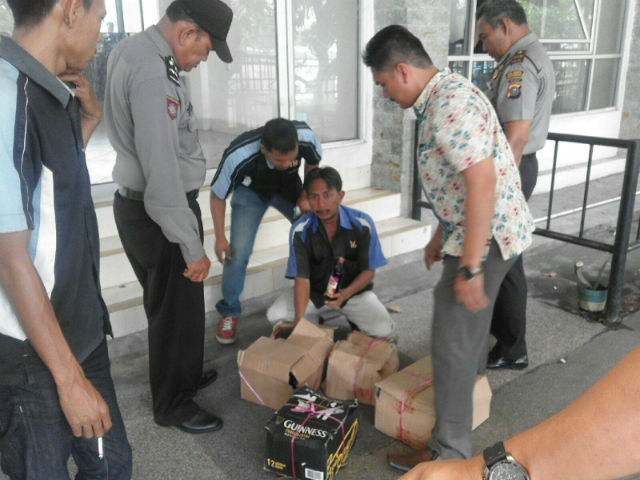 Kali ini puluhan botol minuman keras dengan berbagai merk berhasil disita oleh petugas Kepolisian, Jum’at (8/1/2016) sore di Pelabuhan Sungai Duku.