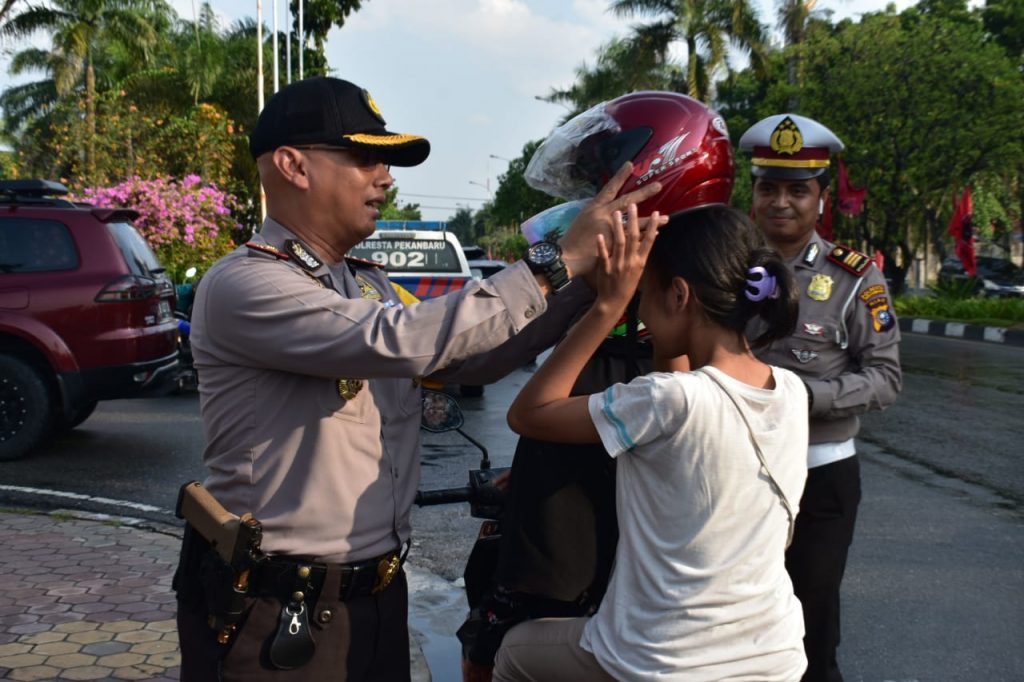 “tidak hanya diberikan kepada pengendara dewasa atau orang tua terhadap anak anak juga kita berikan helm, hal ini dilakukan untuk menggugah para orang tua agar menjaga keselamatan semaksimal mungkin dalam berkendara”, terang Kapolresta.