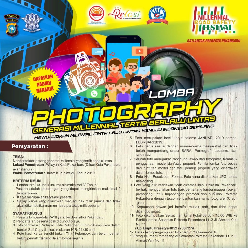 PEKANBARU, SIAGANEWS.CO – Jelang puncak acara dari Millennial Road Safety Festival Satuan Lalu Lintas Polresta Pekanbaru taja lomba Foto dan Video. Adapun Tema dari lomba tersebut yakni “Generasi Millennial Tertib Berlalu Lintas”.