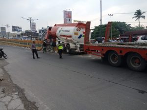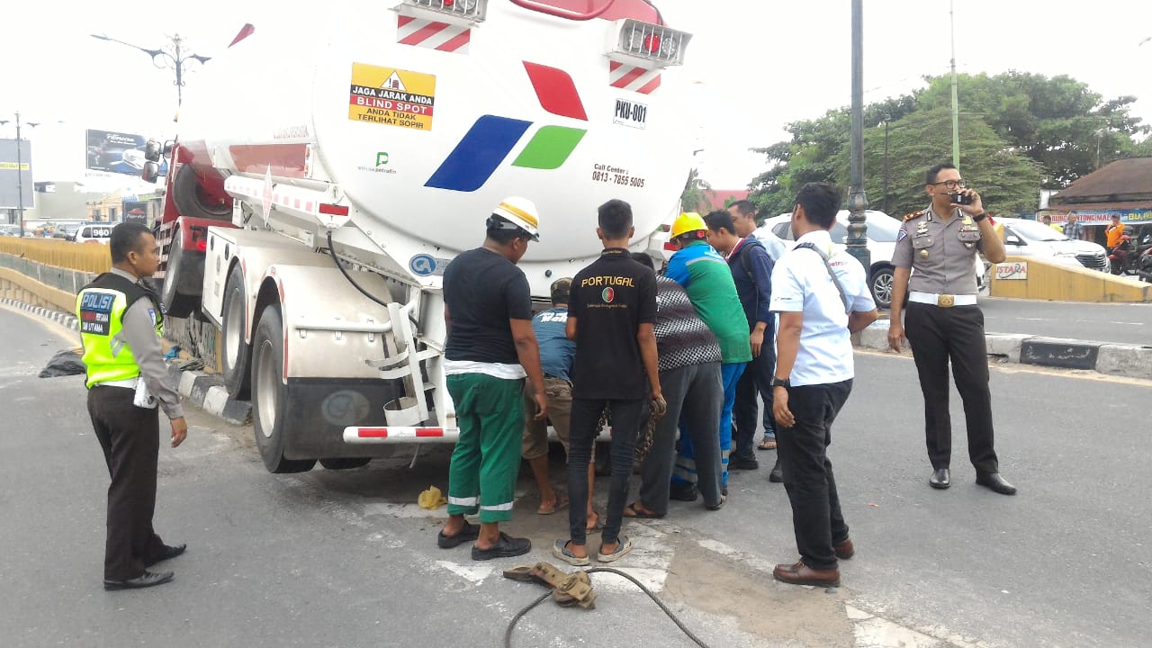 PEKANBARU, SIAGANEWS.CO – Satlantas Polresta Pekanbaru mengevakuasi mobil Truck Tangki Pertamina yang mengalami kecelakaan tunggal (Out Of Control) di Jalan Jendral Sudirman tepatnya di pangkal Fly Over Harapan Raya Senin (1/10/18). Dengan menggunakan satu unit mobil pengangkut alat berat.